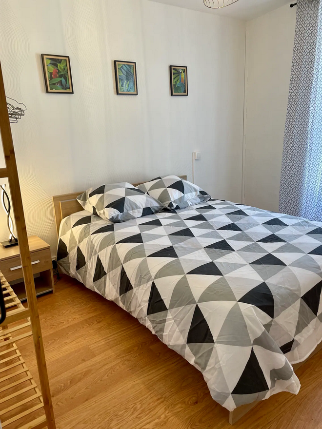 Chambre literie neuve 140×200, portant pour les vêtements.